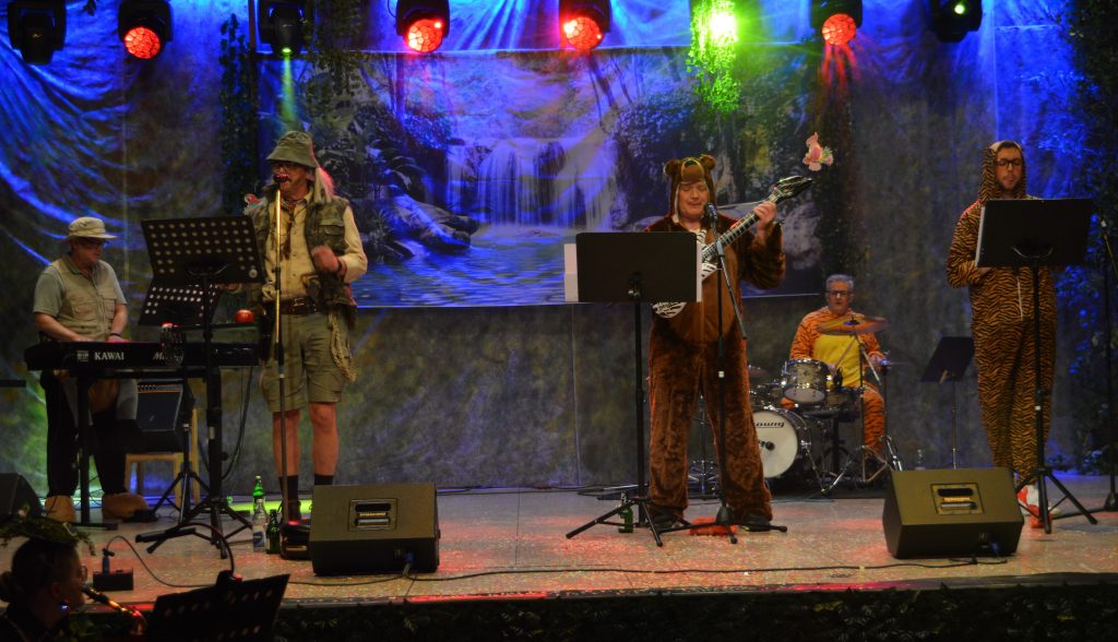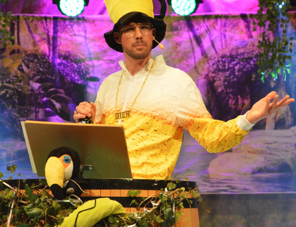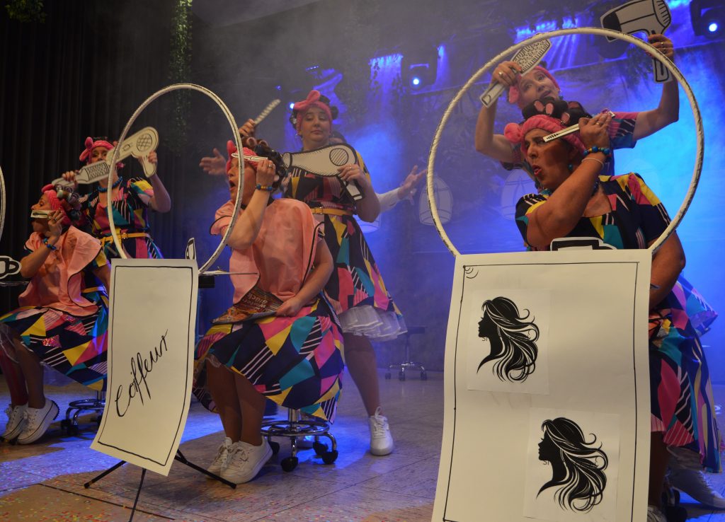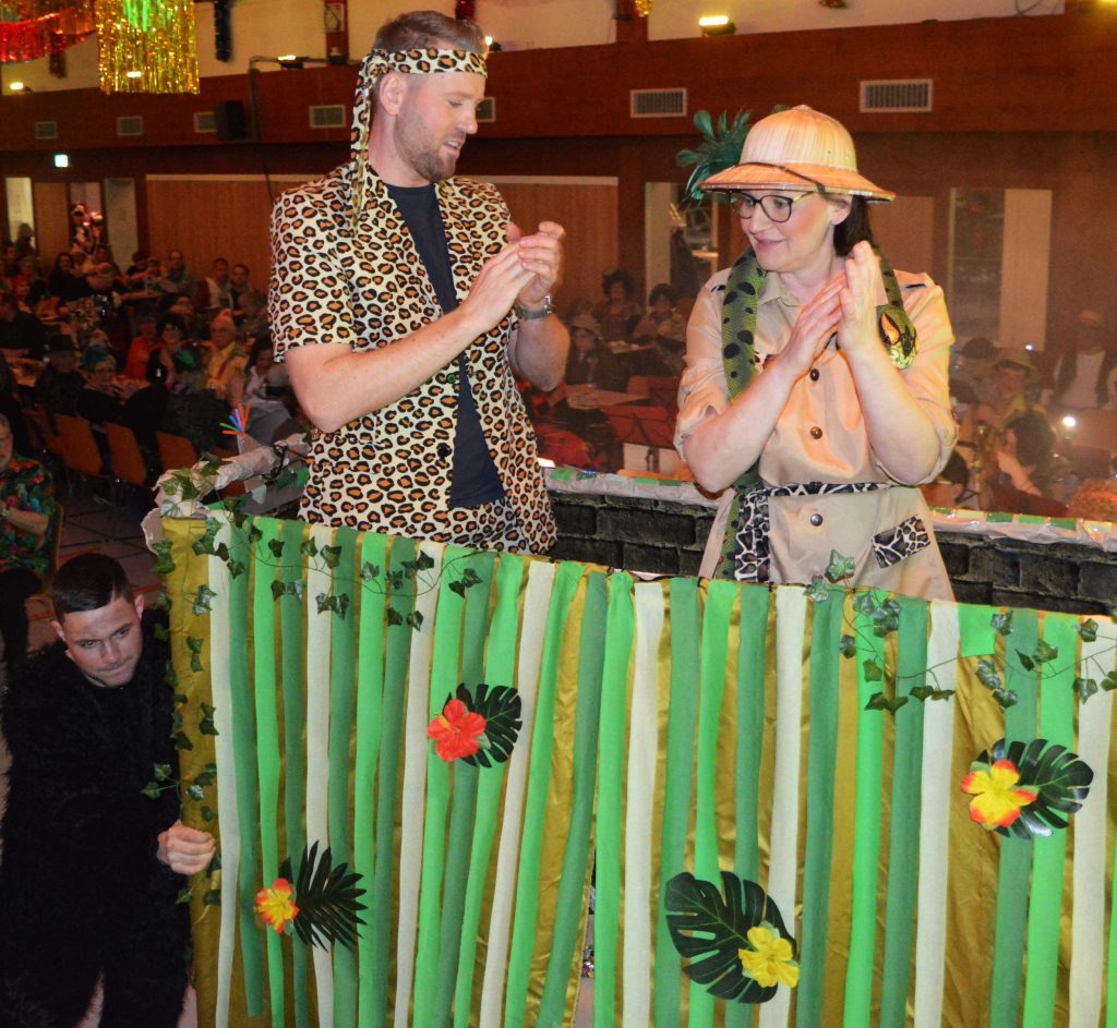 Im feuchtwarmen Dschungel wuchsen die Haare von Moderater Jochen Hummel rasend schnell. Die Tanzgruppe „Nadierli“ um Nicole Maier-Heidt und Evi Wirth griff zur Schere. Die adretten Friseusen schnitten bestens ab. Sie rollten auf Stühlen über das Tanzparkett, föhnten und lasen am Spiegel eine Zeitschrift. Das war einer der Top-Auftritte an diesem Abend.
